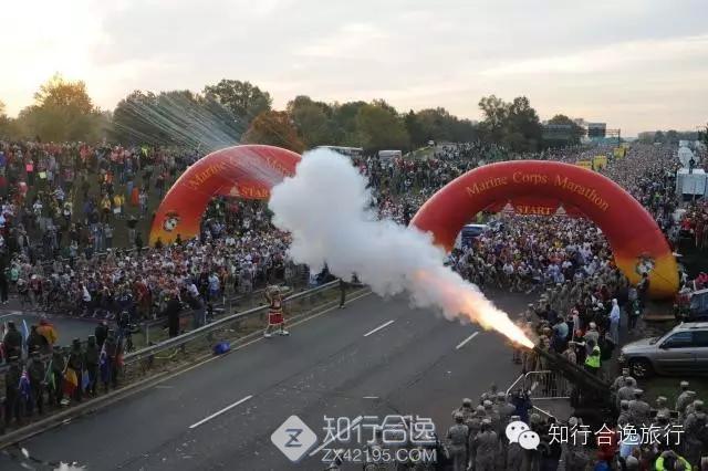 华盛顿海军陆战队马拉松听起来更像是一场军事表演, 起点的出发仪式直接把美军的定点跳伞、低空掠过的战机以及大炮开火搬了上来!让你目瞪口呆,肾上腺素爆表!