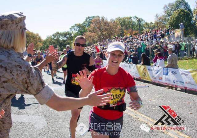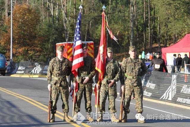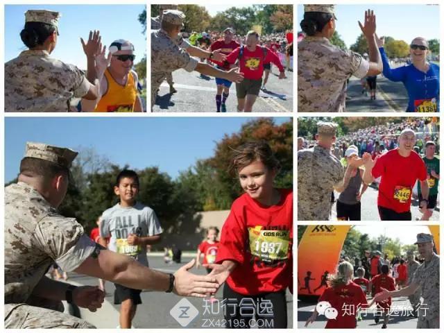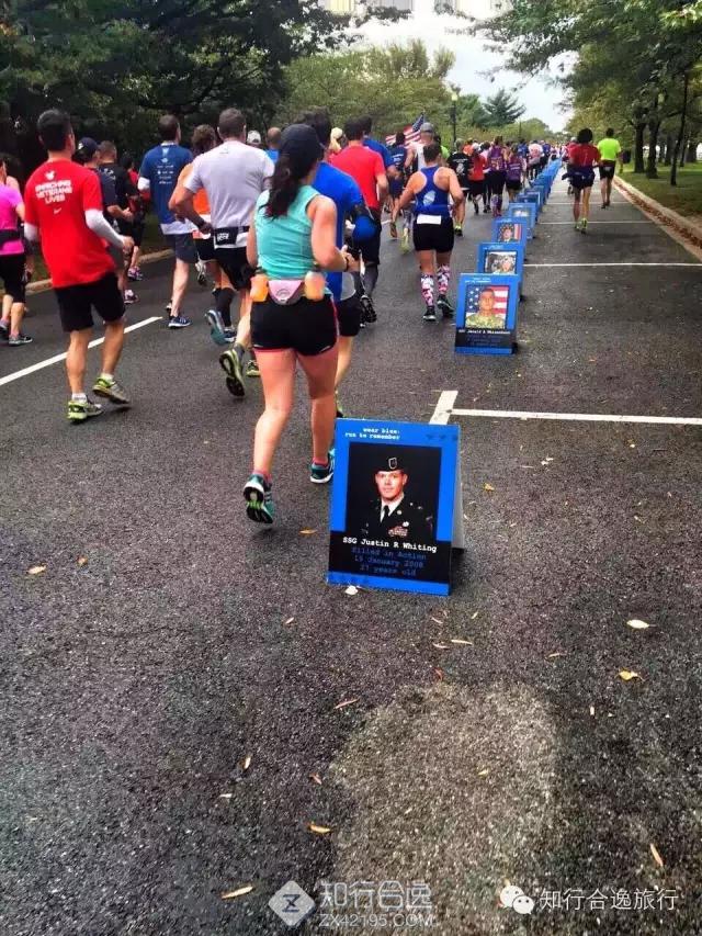 知行君本来以为,最让人振奋的是海军陆战队的大兵们,没想到,这场比赛让人感受最深的是跑者!这次很多跑者在背后挂着逝去亲友的军装照片或是写着纪念的名字,比赛20公里处还设置了照片墙,挂满了在各种任务中牺牲的军人照片,名字和为国捐躯时的年龄,看的让人心酸感慨,再加上无数跑者扛着美国国旗,一路随风飘扬,感觉这场马拉松是一场非常完美的爱国主义教育,简直令人震惊!