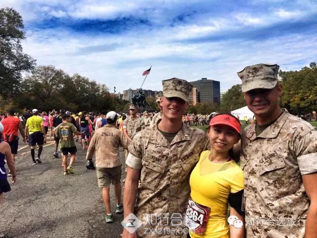 至于比赛过程中就更是帅呆了,一路上全部是美国海军陆战队的队员们,从乔治敦到国家广场,跑者将途经美国华盛顿特区所有的著名景点,全程都有威武的美国大兵提供保障与服务,端茶倒水搞服务喊加油一条龙,完赛后先敬个标准的军礼再给你亲手挂上奖牌,对所有的合影都有求必应笑容满满!