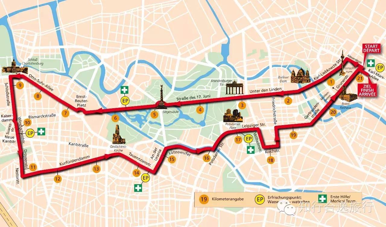 而赛道,自然也延续了柏林马拉松穿过城市精华景点的风格,相当于柏林马拉松的这个世界最快赛道的精华版。比赛以柏林东部的卡尔-马克思大道为起点和终点,途经亚历山大广场,柏林圆顶,勃兰登堡门,胜利纪念柱,夏洛滕堡宫,Kurfürstendamm酒店与威廉皇帝纪念教堂,波茨坦广场,查理检查站,柏林市政厅等柏林著名景区!在春暖花开的季节,用脚下的马鞋完成一次快速的柏林巡游!