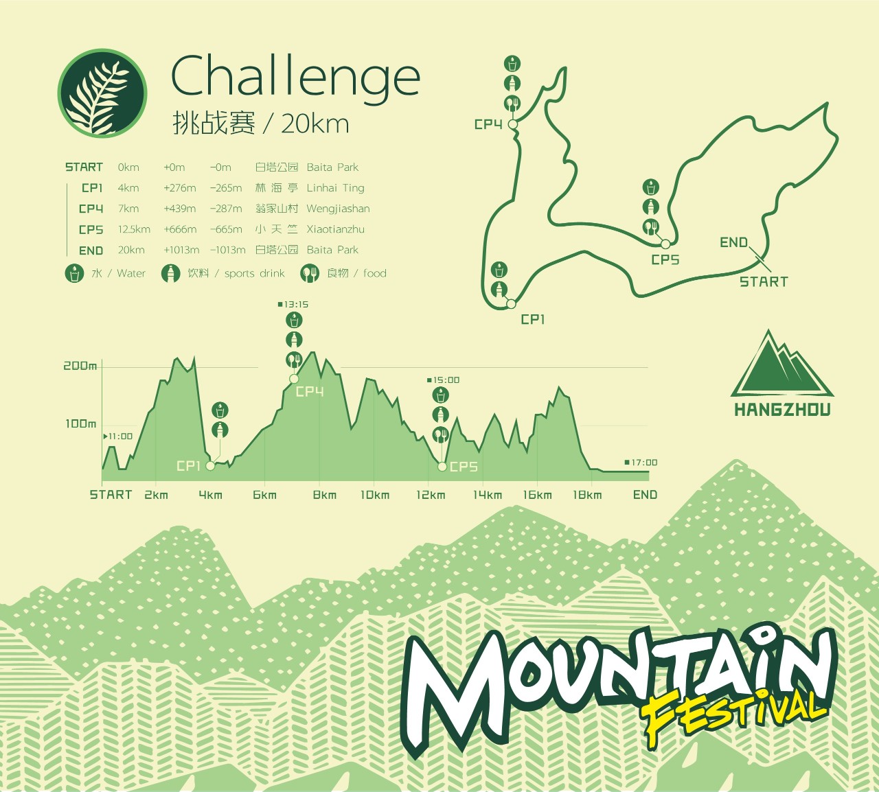 挑战赛:20km,累计爬升2013m,关门时间6小时,报名费人民币320元/人。