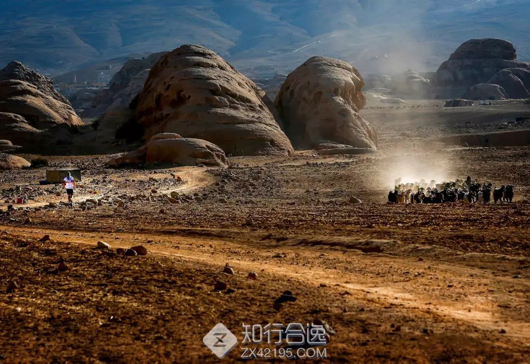 离开佩特拉古城遗址公之后,六公里左右将沙漠方向前进。随着一路尘土飞扬,半马跑者将在这里直接前往河床峡谷“西克阿尔巴德(Siq Al Bard)”,而全马跑者则围绕山顶“阿尔穆什(Al Musirh)”跑一个环线,并继续深入沙漠。