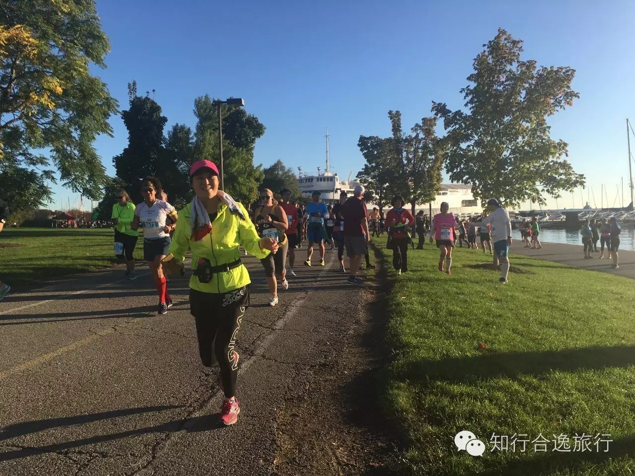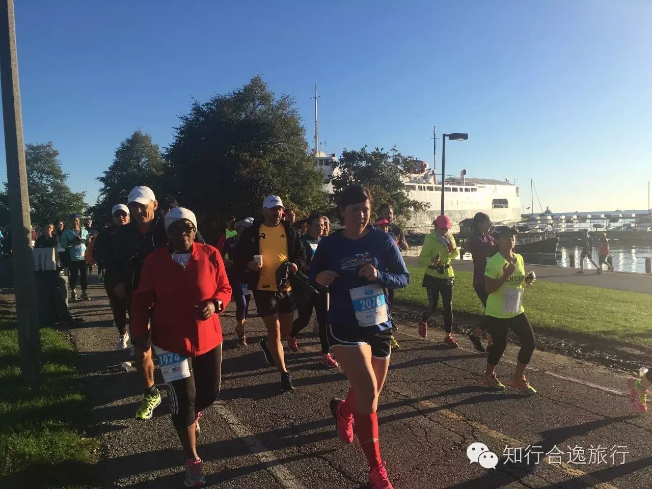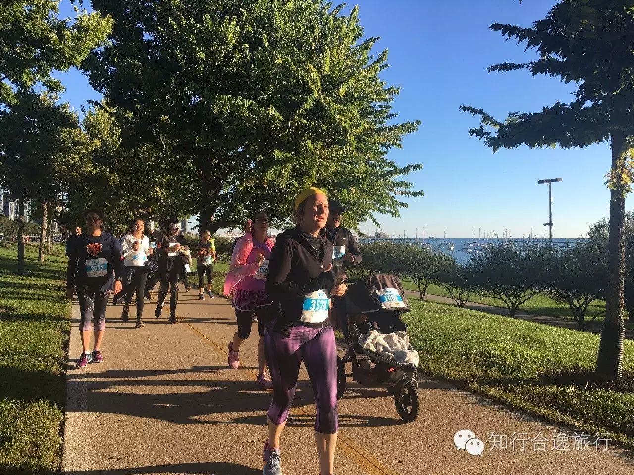 2.5公里后,赛道从城市中心的主干道公路,转为湖边休闲散步小径,密歇根湖畔,碧水蓝天帆船,美不胜收,许多人都忍不住停下来拍照留念。