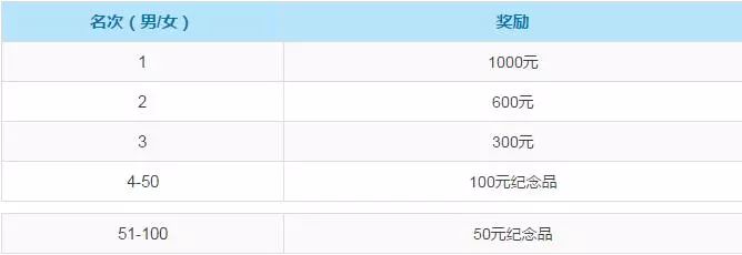 以单站个人成绩进行排名,分别录取10公里前3名成年组男/女运动员给予现金奖励(税前),4-100名男、女运动员分别给予纪念奖励(前3名按净计时成绩录取)。奖励如下: