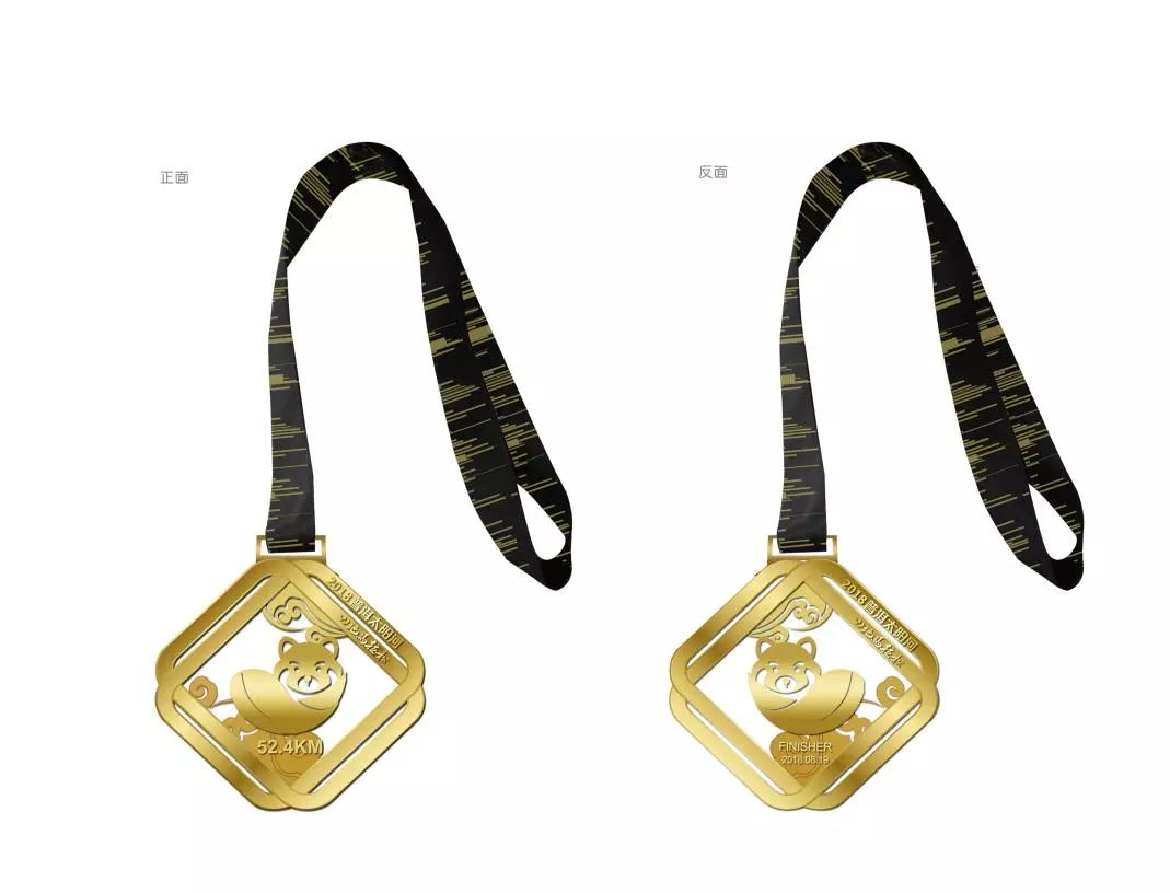 传承前两届赛事奖牌简约精致的设计精髓。采用两个金色方环相盘结作为轮廓,代表“体育+旅游”的赛事理念,奖牌中心是山地马拉松logo,小熊猫在祥云环绕之中,即为参赛选手送上一份吉祥祝福,也寓意“2018·普洱山地马拉松”拥有完善的赛事保障。