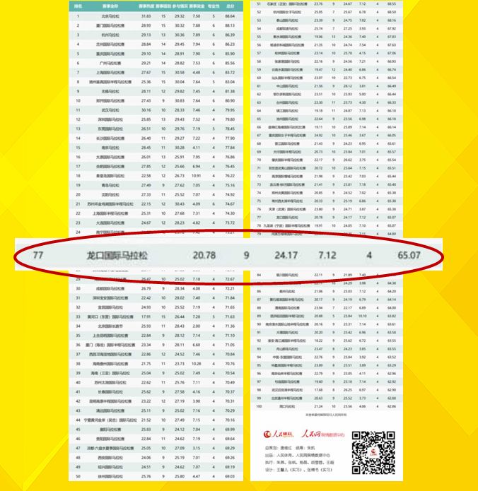 在2017中国马拉松年度盛典上,由人民体育和人民网舆情数据中心从17年国内的1103场800人以上规模的马拉松赛事中,以舆情热度、赛事级别、参与情况、奖金情况、专业性五大维度对所有赛事进行共涉及40余项具体指标的评估而得出上述榜单。