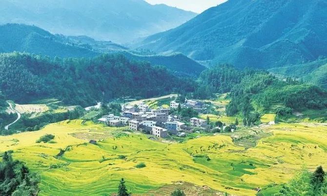 这是欧家梯田的一隅,金色稻浪、远处绿色的大山和淡蓝的天空,三色相映,美不胜收!