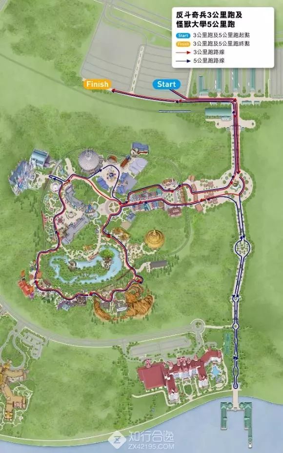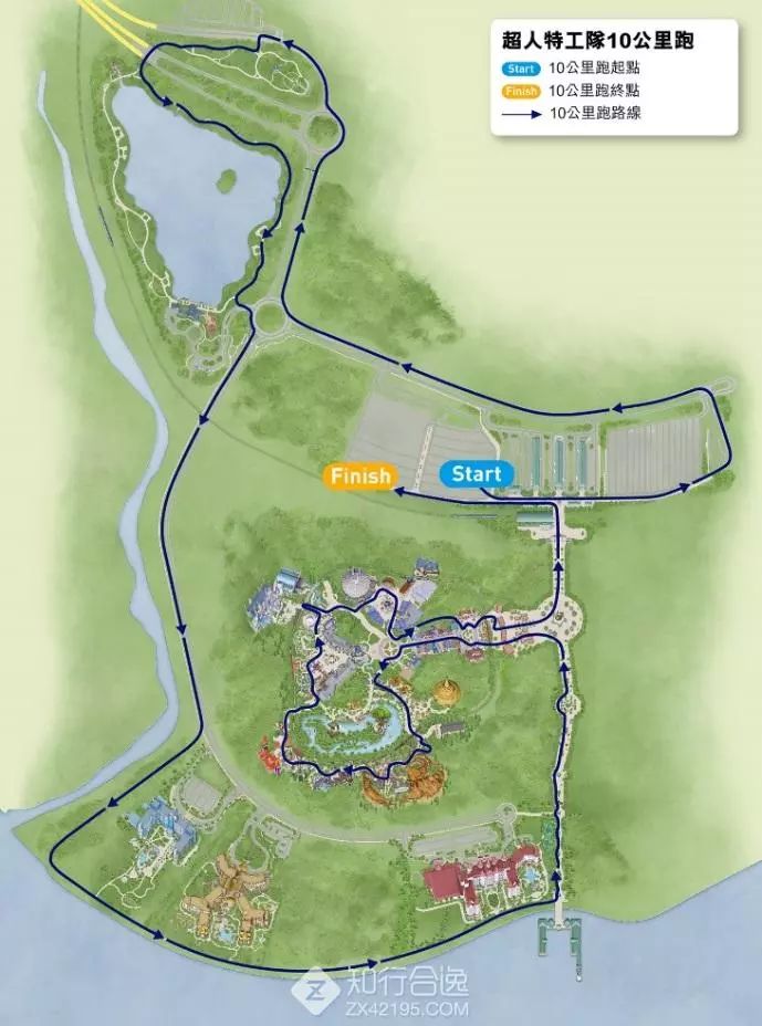 赛事起点及终点设于旅游巴士停车场,沿幻想道及神奇道跑半边迪欣湖,再沿神奇道及海鸣路左转海滨长廊,可以欣赏三间不同建筑风格的迪斯尼酒店,再沿迎乐路跑入园区内的美国小镇大街,在园区内绕一个大圈,看尽园区内各个景点,然后返回旅游巴士停车场冲线。