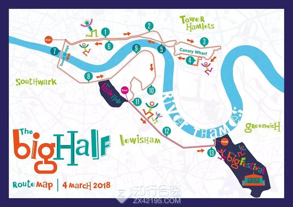 伦敦半马比赛在塔桥开始,据去年的参赛选手自述,起点部分是一段下坡路,随后沿着街道前进,前半程在河的北岸,可以看见著名的碎片大厦,在上图的Canary Wharf(金丝雀码头)绕跑一圈后折返,经塔桥左转,一路向东跑到格林威治区结束。共需穿过萨瑟克、莱维舍姆、托尔哈姆莱茨和格林威治的行政区。