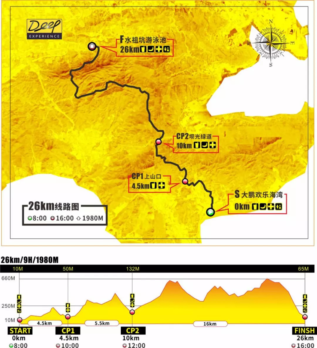起点 → 龙头石 → 鹏程村 → 大鹏坳——上山口(CP1) → 火烧天 → 葵涌坳 → 坝光绿道(CP2) → 绝望坡 → 田心山 → 白老石 → 水祖坑 → 终点,合计约26公里,爬升约2000米
