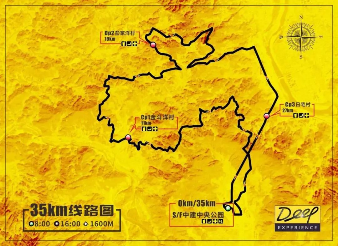 35km组比赛起终点设在福安市溪北洋中建中央公园,全程约35公里,线路总爬升约1600米,赛道为硬化路面、山地、机耕道、丛林等地貌,赛道沿途共设3个补给站及检查打卡点。