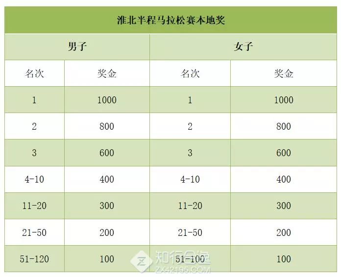 本次比赛组委会特设立淮北本地大众奖(半程马拉松),按淮北本地群众参加半程马拉松选手的成绩单独进行排名(以常住居民身份证或居住证原件为准),奖金如下表。