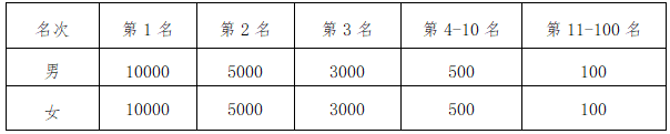1、全马:分别录取录取前100名,前三名各颁发奖杯一座;前100名分别获得奖金,见下表(单位:人民币/元)。