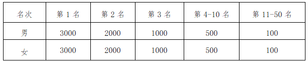 2、半马:分别录取男女前50名,前三名各颁发奖杯一座;前50名分别获得奖金,见下表(单位:人民币/元)。