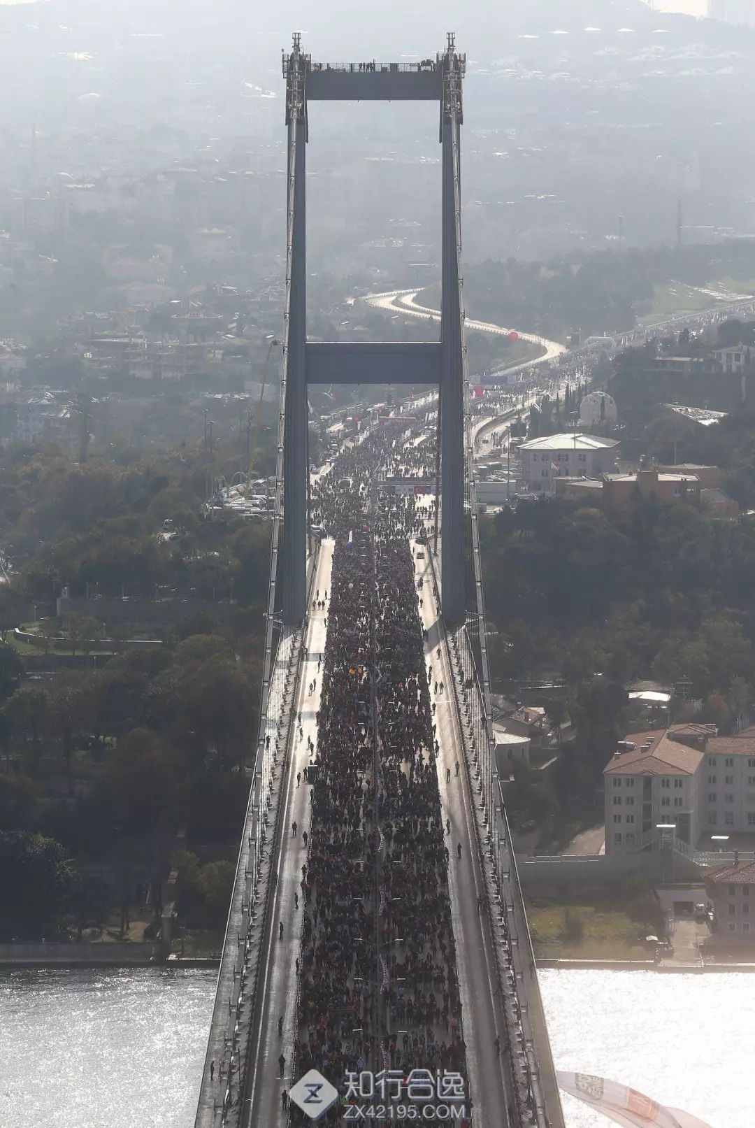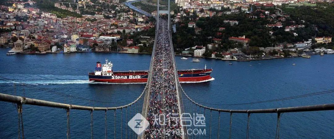 博斯普鲁斯海峡把伊斯坦布尔从中间切开,一分为二,也切开了欧亚大陆的连接,是的,海峡的一侧是欧洲,另外一侧则是亚洲。还好,一座欧亚大桥横跨海峡,把这座城市又连成一个整体。在博斯普鲁斯海峡大桥的正中,醒目地画着一条白线,这便是欧、亚两洲分界的标志。 不过很遗憾,大桥并没有设立人行道,只有乘车才能从亚洲开到欧洲。想用你的脚步丈量欧亚大地的分界线?只有这一种办法了——参加伊斯坦布尔马拉松,博斯普鲁斯海峡大桥封路给你跑!1.5公里,十分钟,从亚洲到欧洲!