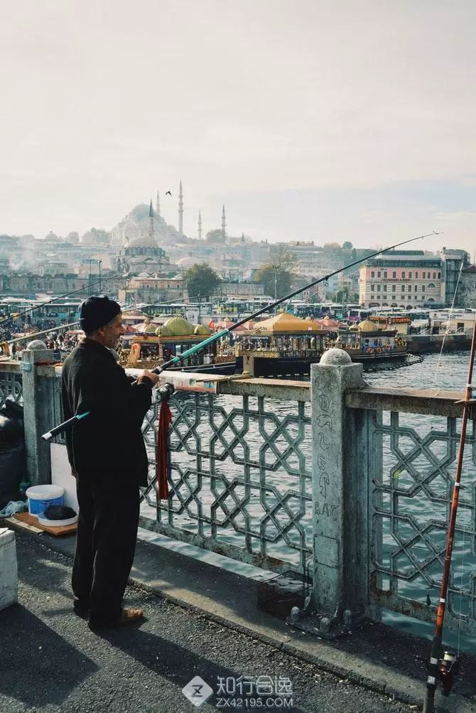 日落时分,在加拉塔大桥上排满了钓鱼的人们,大家都拿着彩色长长的鱼竿在悠闲地等待鱼儿上钩。夕阳照着海水还有游船,还有远方大大小小的清真寺,天空上不断飞过海鸥,就像是一幅油画。跑马过后,去大桥上体验一下垂钓也是别有滋味~