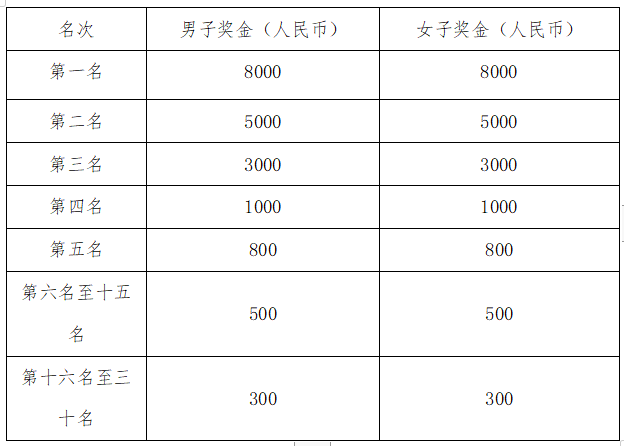 组委会为各年龄段中国籍参赛选手设置名次奖金,分别获得奖金200元人民币。根据净计时成绩分别录取各年龄段男、女第1至第10名选手,各年龄组名次奖获得者将于比赛后三日内通过官网公布,如无疑义,所获奖金汇入参赛选手的预留银行卡。