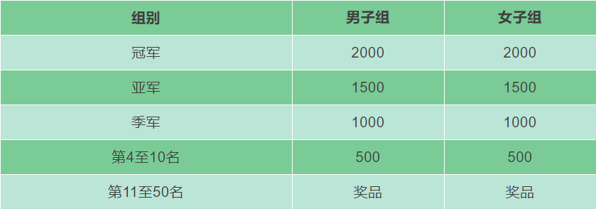 男、女前10名皆有奖金发放,11-50名可获得精美奖品;所有完赛者均有纪念奖牌。
