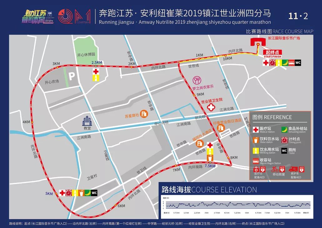 11月2日,镇江世业洲四分马,看那奔跑的人潮,听那滚滚的江涛,品那肆意奔跑的乐趣。长江国际音乐节广场入口(起点)—沿内环北路(右转)—内环南路(第一个红绿灯左转)—中学路—经状元桥(右转)—经世业镇卫生院—内环北路(右转)—长江国际音乐节广场入口(终点)