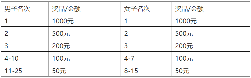 2019年11月17日8:30-11:00在唐王广场鸣枪半程马拉松按枪声成绩录取名次。男子前25名,女子前15名获得奖金(见下表,奖金发放时将按国家规定扣除相应税金)。2、半程马拉松男、女第1至第3名选手分别颁发奖杯一座、奖牌一枚。3、所有半程马拉松完赛选手均可获得完赛补给包和纪念奖牌一枚。4、迷你马拉松:成绩由参赛者自行记取,不记录名次,组委会为参赛选手提供纪念证书、运动衫、号码布。(1)半程(21.0975公里),关门时间为3个小时。