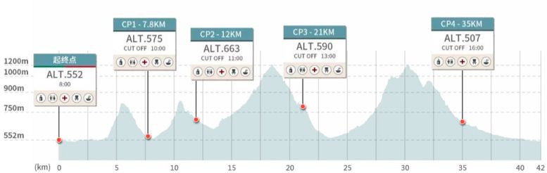 42公里的具有一定难度,老司机请关注。赛道前半段为传统徒步线路,后半段为新开辟的线路,景色秀美,山峰高耸。适合有丰富经验的越野跑者。