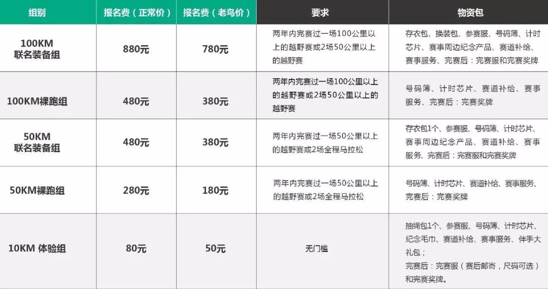 A:裸跑组是只提供号码布、计时芯片、赛道补给、赛事服务、完赛奖牌的组别,因此报名费较低。联名装备组:提供含裸跑组物资和服务以外的大全套:抽绳包、参赛服、完赛服以及赛事周边纪念产品等。
