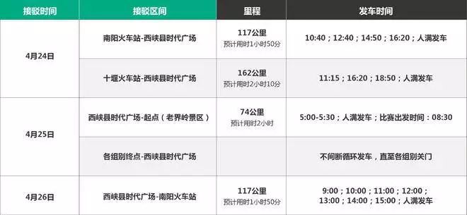 组委会将在南阳火车站、十堰站、西峡县城和各组别终点设置交通接驳站,方便选手乘坐大巴抵达西峡县城、比赛起点和完赛后返回县城。(发车时间以赛事手册和短信通知为准)。