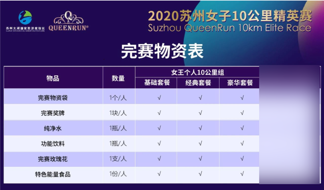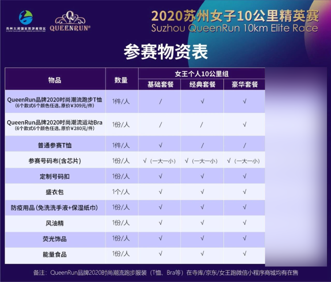 | 注:标准参赛物资:含计时芯片、参赛号码布、定制号码扣、保险、盛衣包、防疫用品、风油精、荧光饰品、能量食品、完赛物资、现场丰富大奖抽取。(QueenRun品牌2020时尚潮流跑步服装在寺库/京东/女王跑微信小程序商城均有在售) |