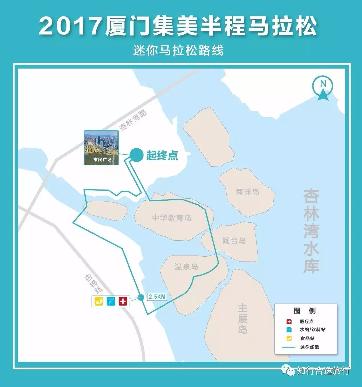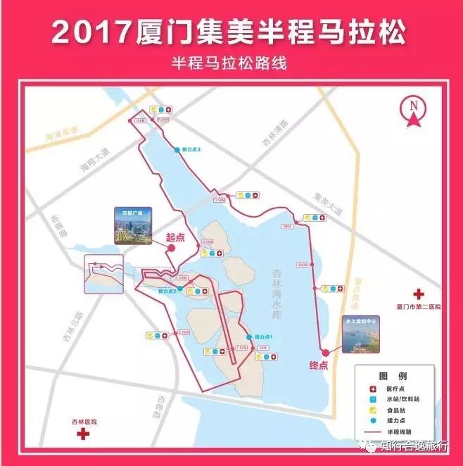 迷你马拉松路线:集美市民广场(起点)→滨水步行道→园博苑景观道路→温泉岛→园博园北大门→清远桥→皓洁桥→中华教育岛→集美市民广场(终点)