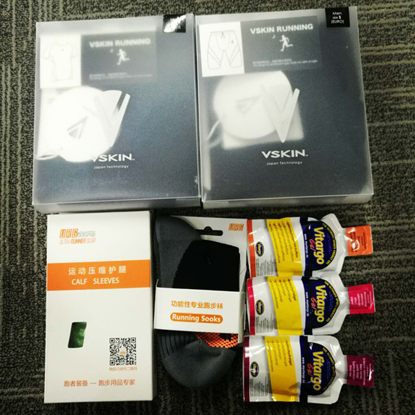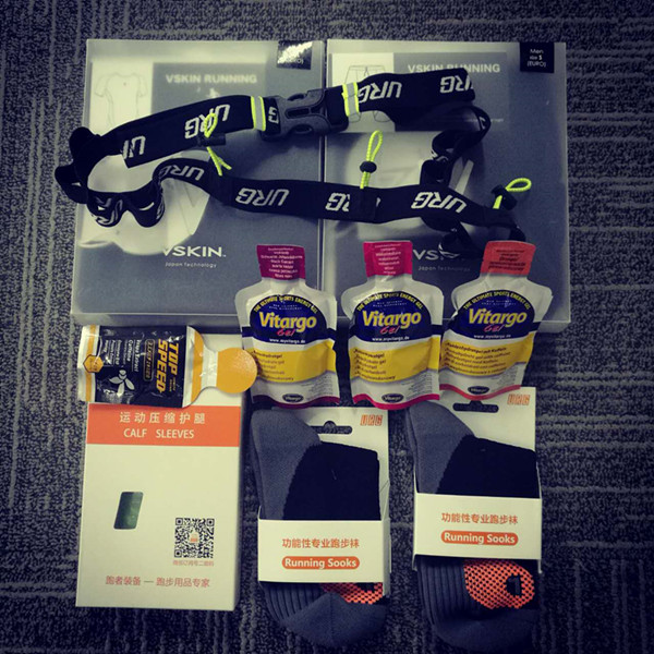 URG 2.0 越野袜两双(价值96元),URG 小腿套一副(价值198元),URG 号码布腰带一条(价值58元),VSKIN压缩短袖短裤一套(价值456元),Top Speed蜂蜜能量胶一个(价值55元),Vitargo能量胶三个(价值75元);
