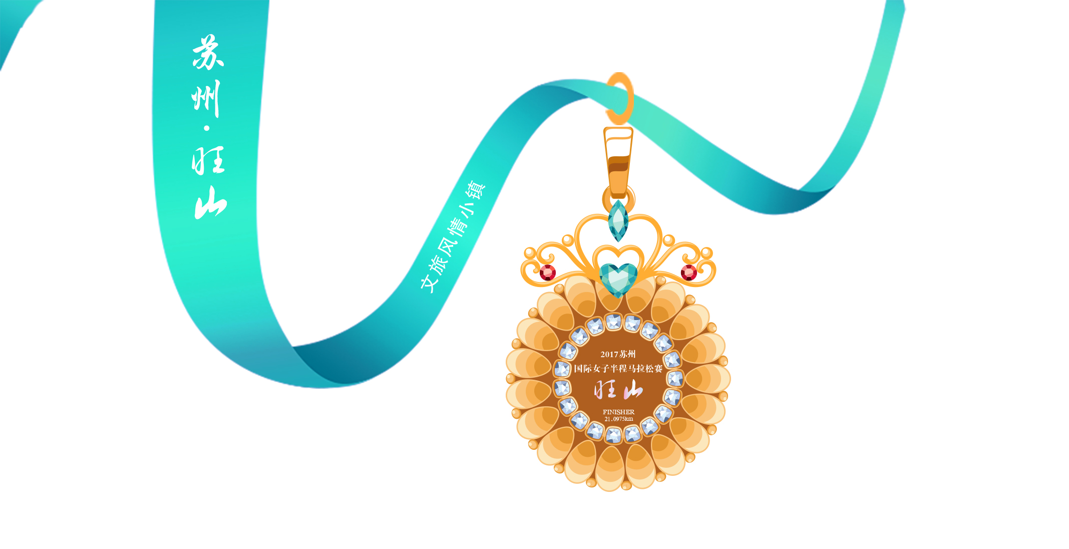 女子个人半程组奖牌:顶部饰以柔美的女王王冠元素,并镶嵌蓝色心形宝石和红色圆形宝石点缀,中间镶嵌一圈施华洛世奇白色水钻。寄语:每一位热爱运动、健康、积极向上的女王都值得拥有这么一块满满女王范的女王跑专属奖牌。