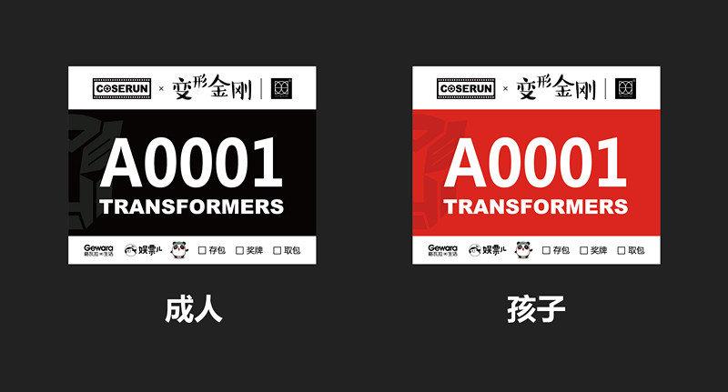 亲子(一大一小):定制T恤X2、背包X2、号码布X2、水杯X1、变形金刚手办X2