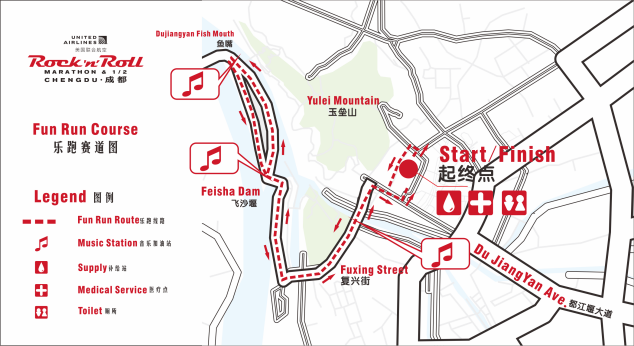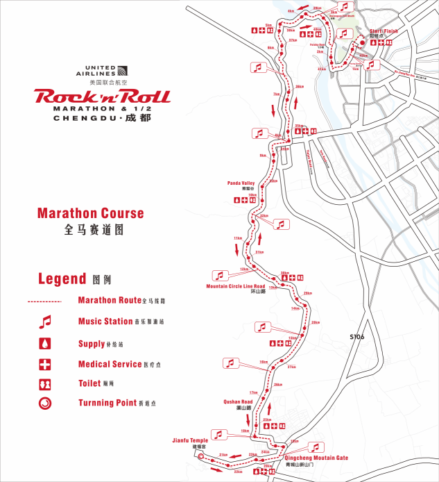 Old town (Start)— Shuyuan street— Wenmiao street— Yulei Moutain square— South street— South bridge— Fuxing street— Flying Sand Fence - Fish Mouth Water-Dividing Dam—Moertan reservoir—G213 road—Panda valley— Qingyun road—Qingzheng street—Qingcheng Moutain arch— Qingcheng Moutain road—Jianfu temple (Truning point)— Qingcheng Moutain road—Qingcheng Moutain arch—Qingzheng street—Qingyun road—Panda valley—G213 road—Moertan reservoir—Fish Mouth Water-Dividing Dam—Flying Sand Fence— Fuxing street— South bridge—South street—Xingfu road— old town (End).