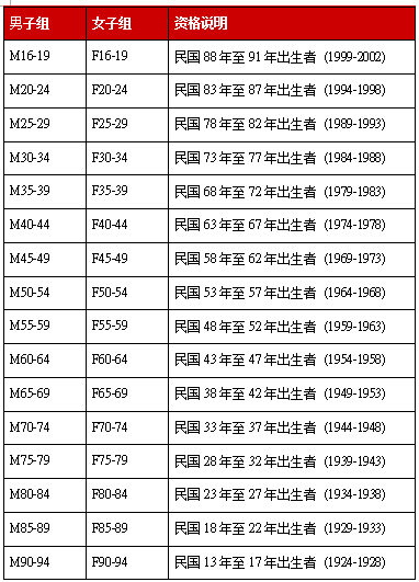参赛者所属年龄组别将以其在2018/04/28时的年龄为基准。组别及年龄分组如下: