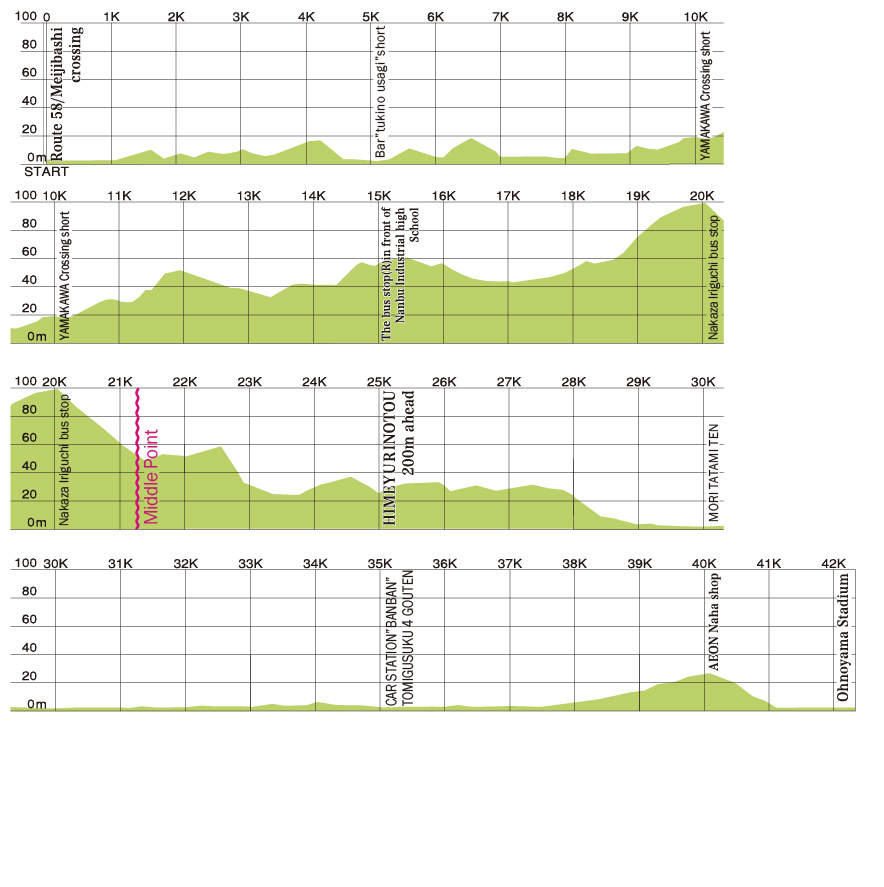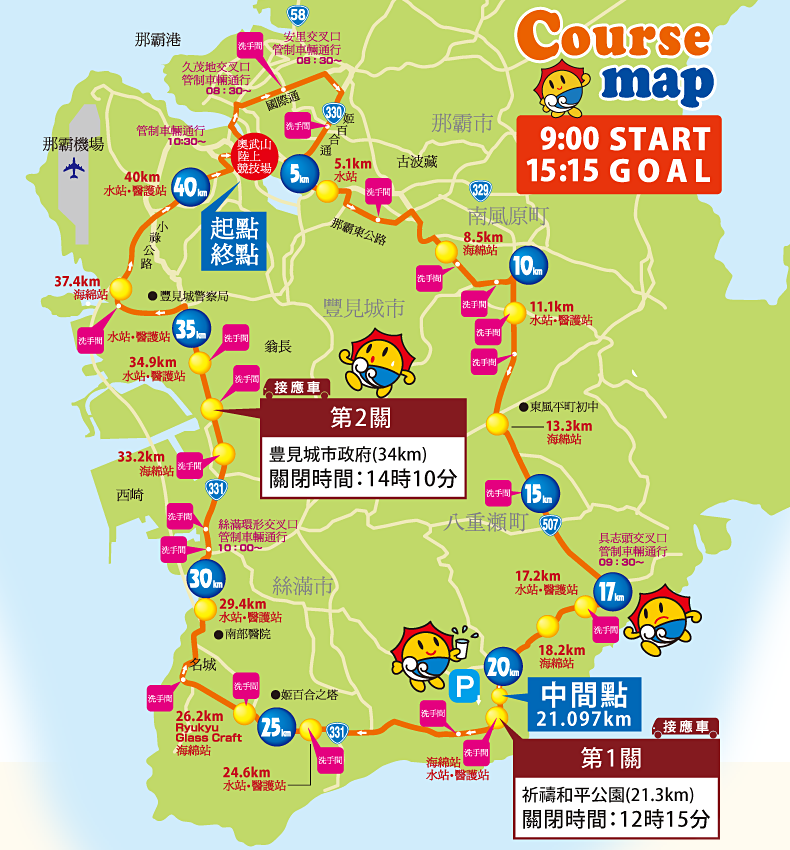 马拉松路线以祈祷和平公园为中心,经过那霸市、南风原町、八重瀨町、系满市、丰见城市的南部5个市町,全程42.195公里。