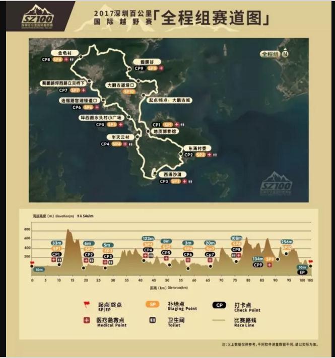 全程组赛道距离105公里,累计爬升5461米。该赛道涵盖了深圳大鹏半岛各条经典穿越线路,赛道大部份为越野路线,其中包含59%山野土路,12%沙滩及海岸线,6%水泥路、10%台阶及石板路、13%绿道。