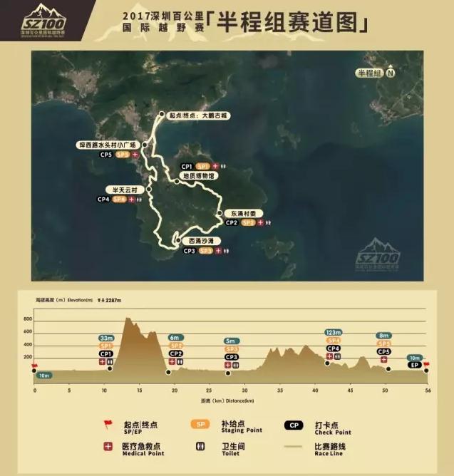 半程组赛道距离55.9公里,累计爬升2287米。该赛道涵盖了深圳大鹏半岛多条经典穿越线路,赛道大部份为越野路线,其中包含38%山野土路,22%沙滩及海岸线,20%水泥路、10%台阶及石板路、10%绿道。
