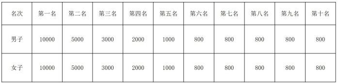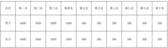 名次奖励:男、女奖励前10名运动员,并分别获得奖金(单位:元,税前),男、女前三名颁发奖杯。