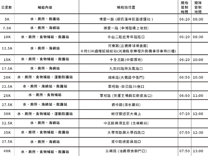 注意: 为保护选手安全及考量交管时间,大会将于赛道中途设置若干关门收容点(预拟时间如下表),并于各点严格执行关门收容,凡未于各关门点限制时间内通过者,一律强制终止比赛并请上大会接驳收容车,且关门之收容选手不得异议。