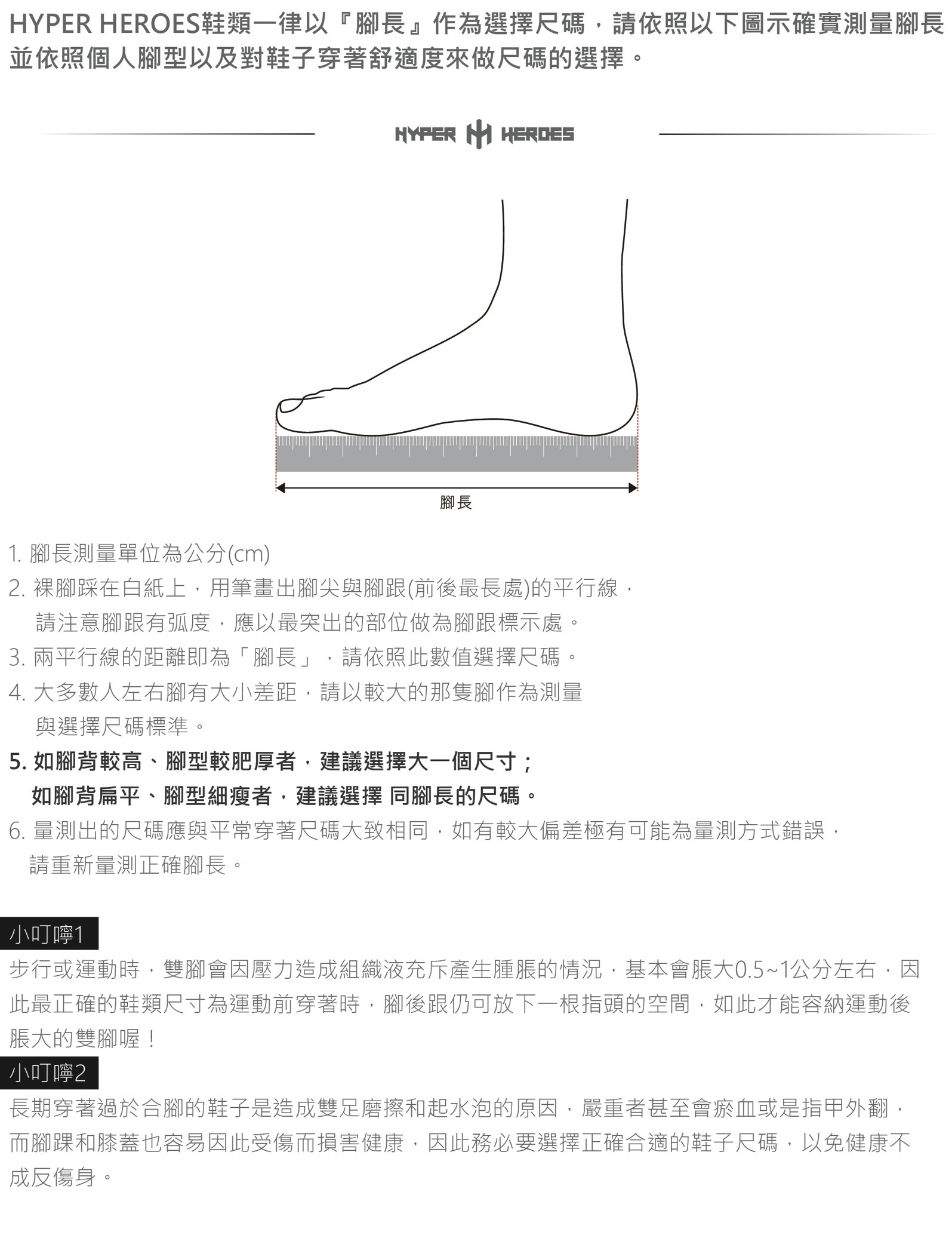 1. 請依照圖示說明,確實量測腳長並選擇尺寸,一旦提交资料,将无法更换尺码。