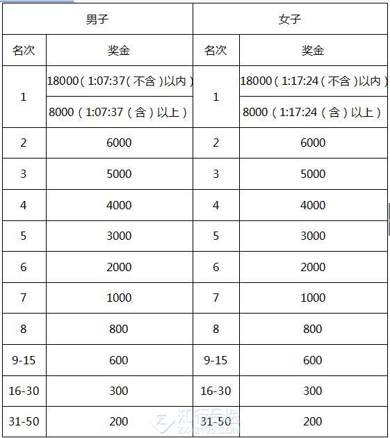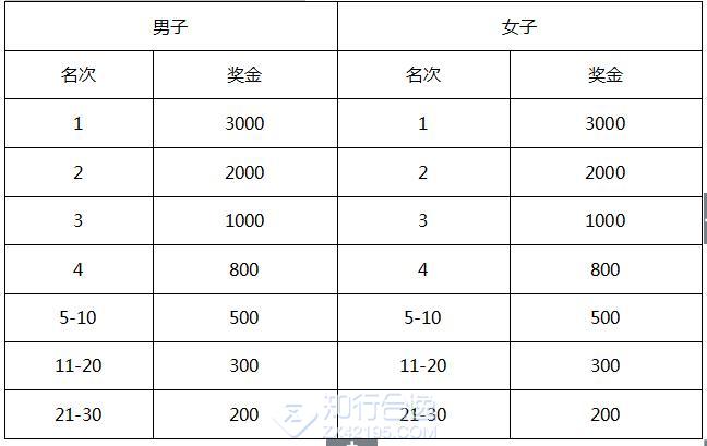 总成绩男、女前50名选手,分别获得奖金(单位:人民币元),前三名成绩以枪声成绩为准。