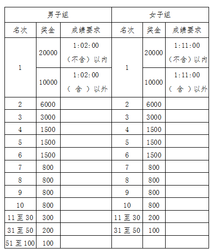 男/女前3名按枪声计时成绩录取,第4名开始按净计时有效成绩录取,并分别获得现金奖励见下表。(人民币,单位:元)