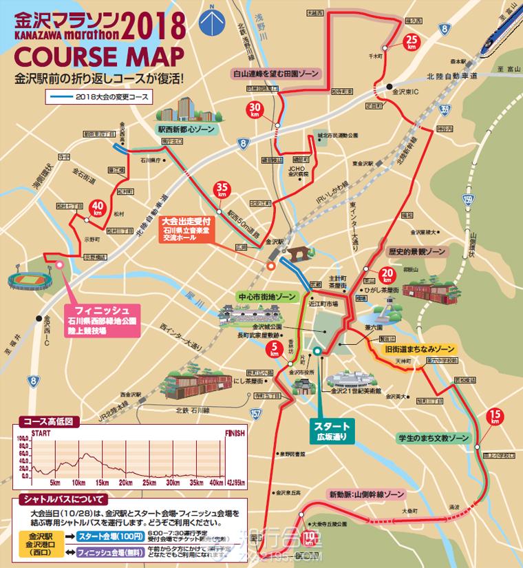 以金泽市广坂街(SHIINOKI迎宾馆)为起点,石川县西部绿地公园田径竞技场为终点。 赛道经过七所地带,让您从不同的角度欣赏金泽:【历史景观】、【城市中心区】、【新动脉开发区】、【学院区】、【古道区】、【田园区】、【新中心区】。