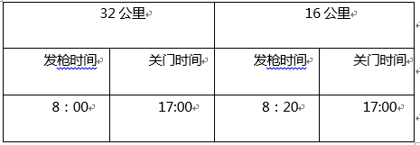 (二)起跑顺序和发令:本届赛事采用“分枪起跑”的方式,共分两个出发时间,32公里参赛者在上午8:00准时发枪,16公里参赛者在上午8:20准时发枪。