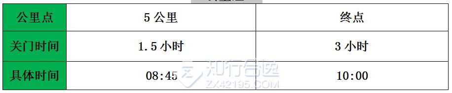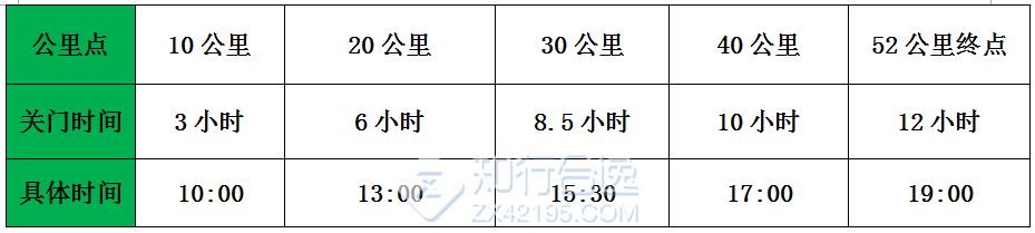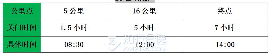 为了保证参赛运动员比赛安全、顺利、限时进行关门时间,到达关门时间后,相应公里数的计时打卡工作停止工作,相应服务站工作将撤台,在规定关门时间内,未跑完对应距离的参赛运动员须立即停止比赛,退出比赛。退出比赛的运动员可在沿途咨询赛事志愿者询问收容车位置或自行选乘交通抵达终点。