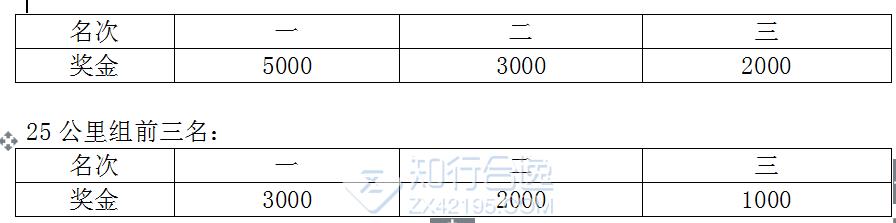 52.4公里、25公里组,分别录取男、女前三名,分别获得奖金和奖杯一座。