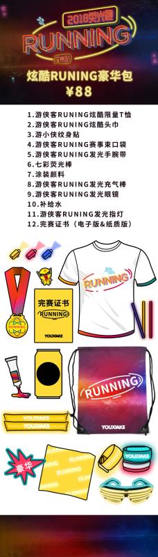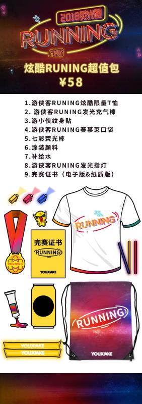 沿途欣赏夜光景色,终点享受夏日湿身音乐派对的快乐氛围,是一场结合荧光元素的夜跑,它更来自于跑者与无数伙伴们用夜色和荧光液交洒的狂野。