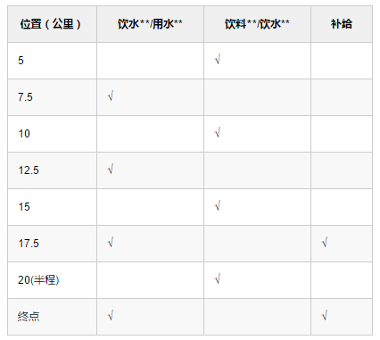 1、自起点5公里处开始,每隔2.5公里处设置饮水站及补给点。参赛选手可补充饮用水及运动功能饮料、香蕉等。欢乐跑/亲子跑终点处将有补给食品(如:香蕉、糕点、饮料等)。