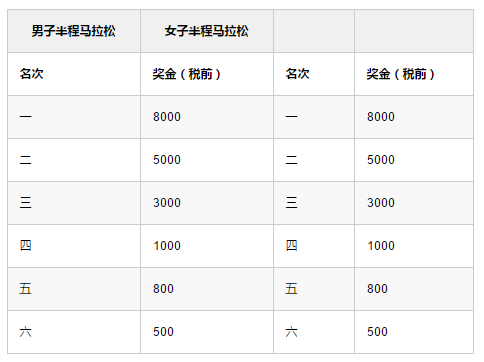 半程马拉松录取男、女个人前6名进行奖励,按照枪声计时成绩排名,分别获得奖金如下(单位:元,人民币);