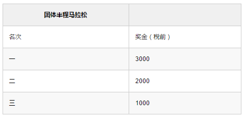 半程团体赛必须全组完赛,取每组(半程各组前5名)到达终点时间累计相加为团体最终成绩并按排名顺序依次录取,获得第1名至第3名的团体将分别获得如下表所列的奖金(单位:人民币)。